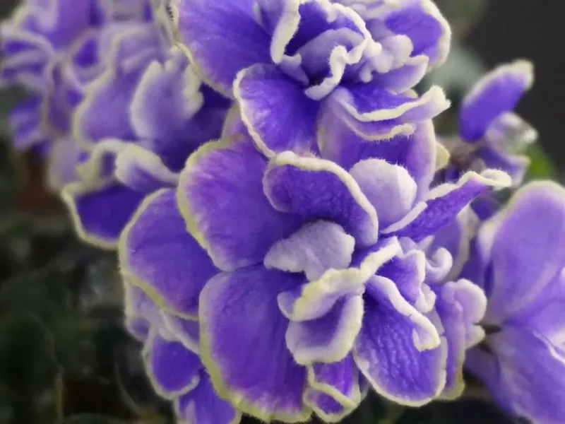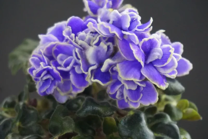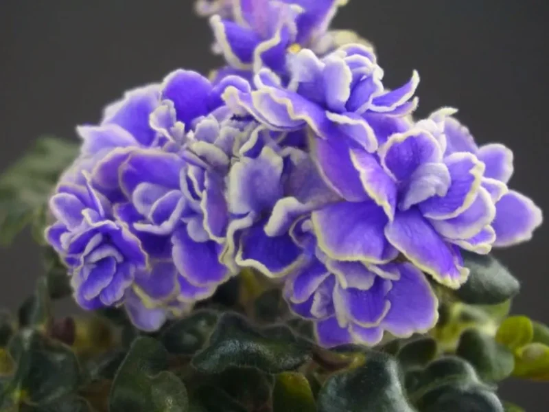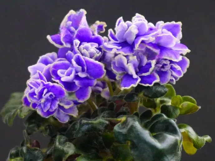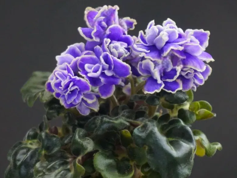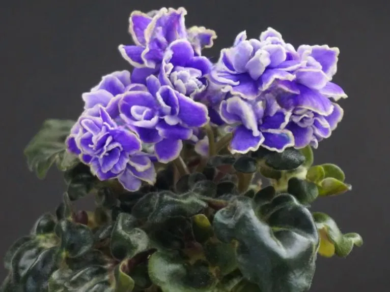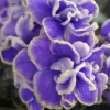 Махровые сиреневые волнистые “,розочки”, с осветленной красноватой каймой. Лепестки у цветка очень плотные, подвернуты внутрь.