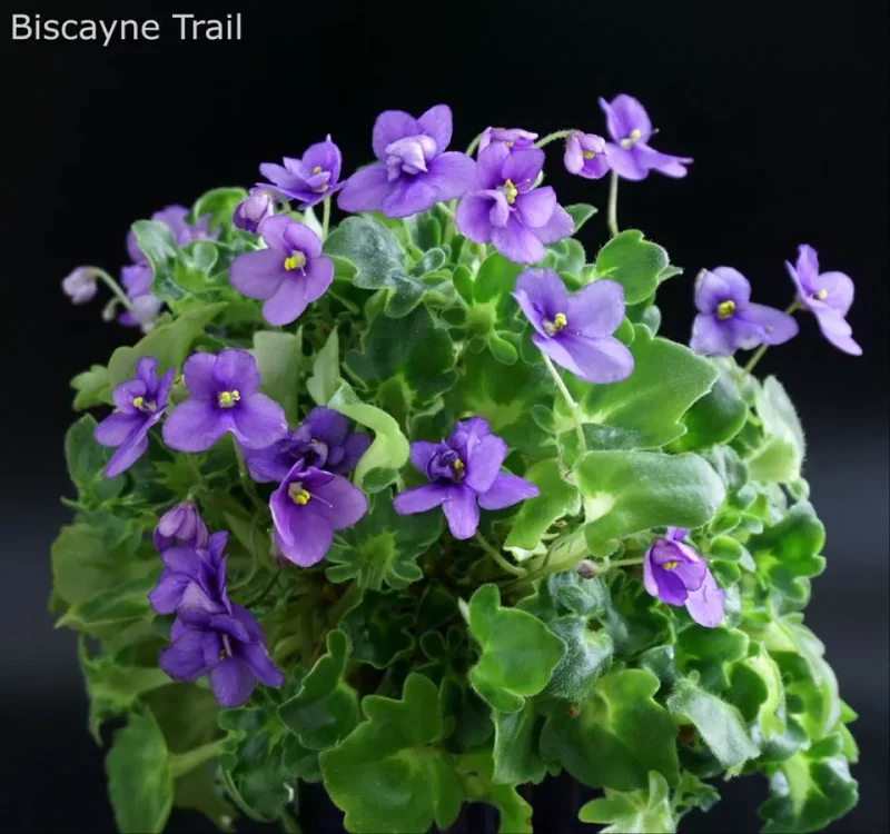 Biscayne Trail (S. Williams) Single/semidouble lavender blue. Champion variegated girl foliage. Semiminiature trailer