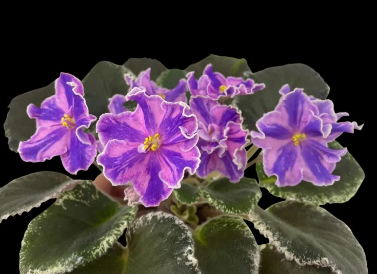 Простые и полумахровые розовые звезды с фиолетовыми химерными полосами и белой карандашной каймой.