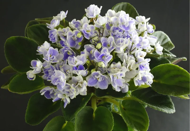 1996. Semidouble/double pale lavender and white. Medium green foliage. Semiminiature.