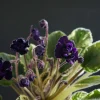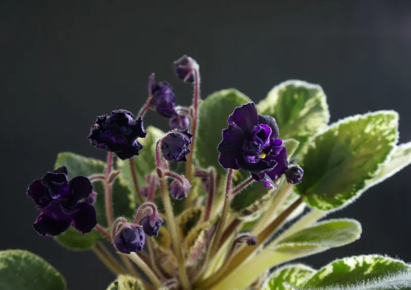 Semidouble black ruffled pansy/dark coral-red reverse. Variegated medium green and white, ovate, serrated. Semiminiature.