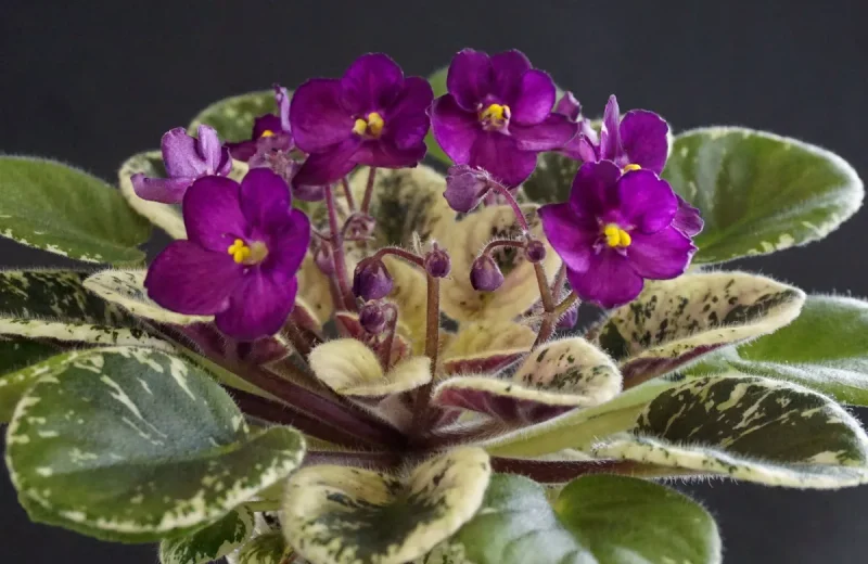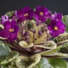 Semidouble two-tone fuchsia pansy/darker upper petals. Variegated medium green, white and pink, heart-shaped, quilted. Semiminiature.