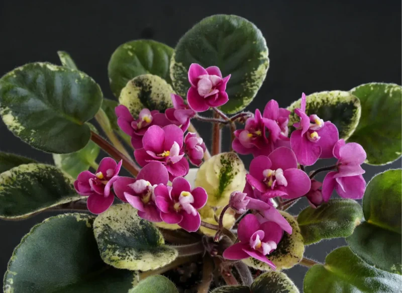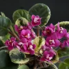 Single-semidouble coral pink pansy. Crown variegated medium green, yellow and variable pink, plain, ovate, hairy, serrated. Semiminiature.