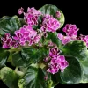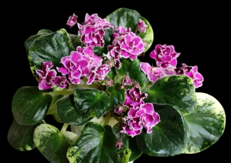 Крупная полумахровая двухтоновая тёпло-розовая до красного анютка. Центр цветка более тёмный. Край белый, бахромчатый. Зелёная листва с кремово-белой кроновой пёстролистностью.
