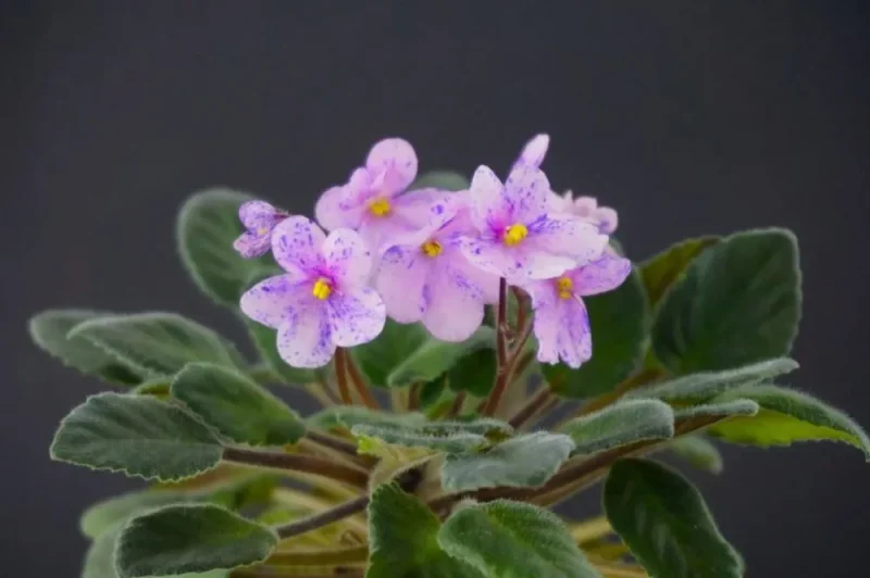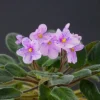 Очень крупные цветы фиалковой формы, розовые с фиолетовыми штрихами обильного фэнтази. Средне-зеленая с розовой изнанкой листва. Полумини.