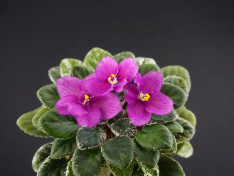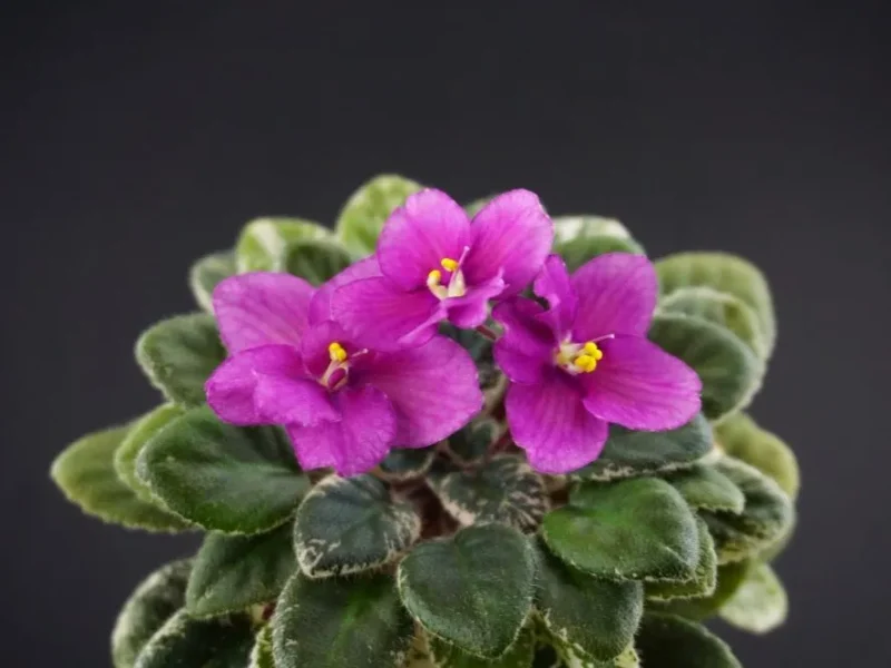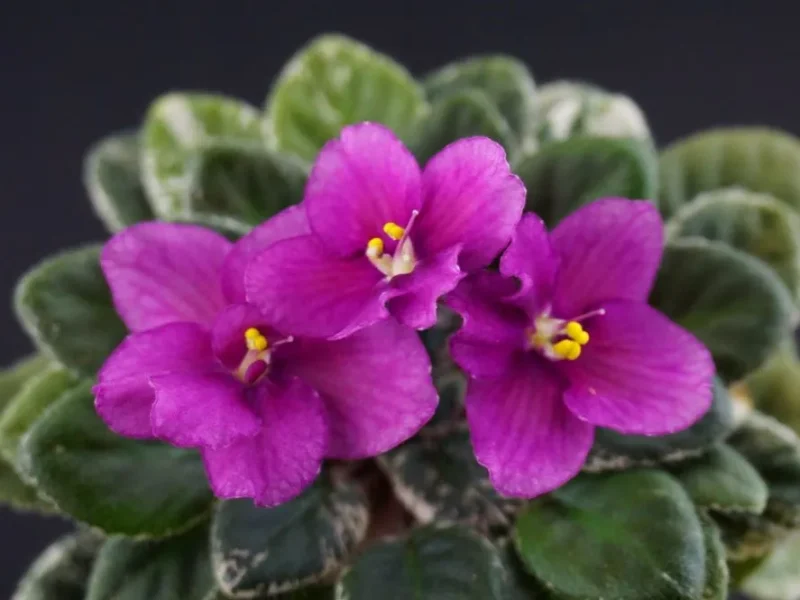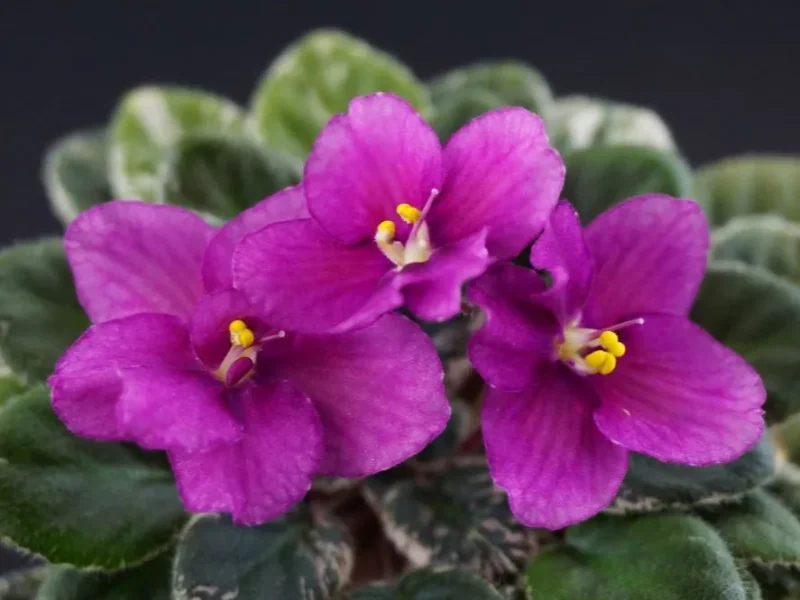 Крупный простой темно-бордовый цветок с тонкой белой каймой. Темно-зелено-белый пестролистник. Полуминитаюра.