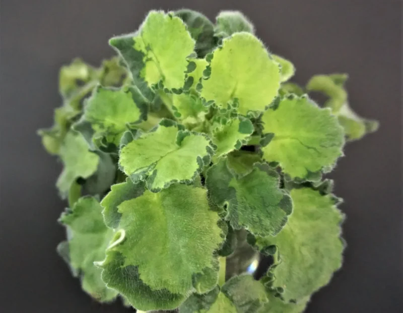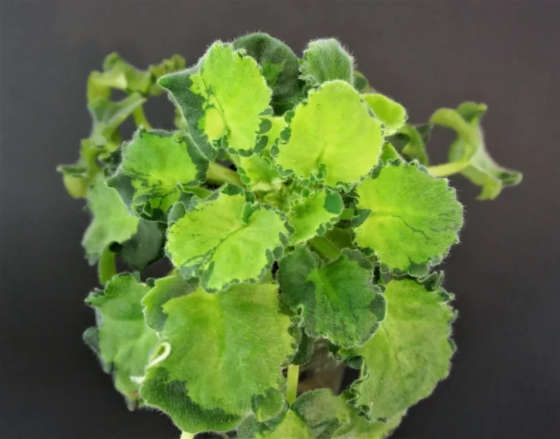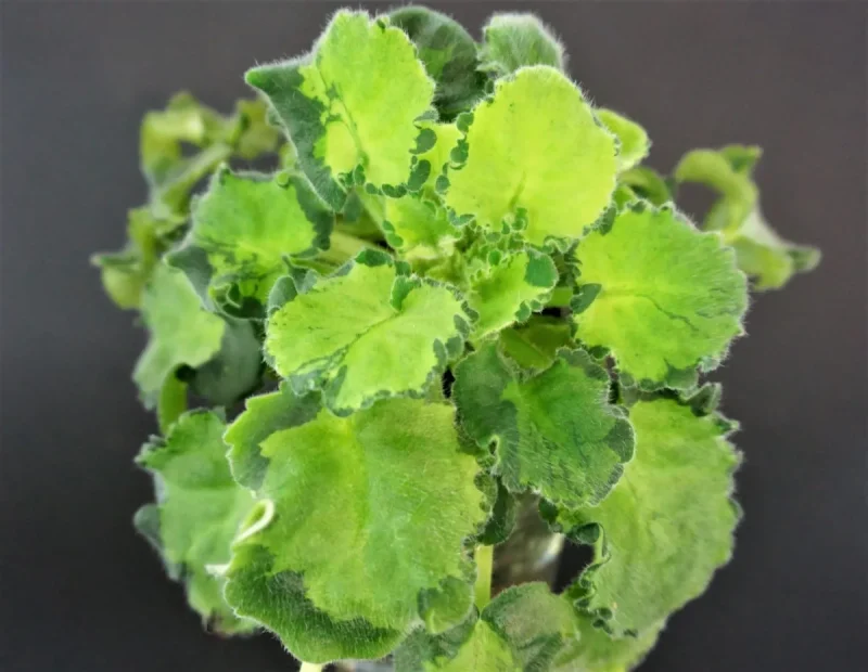 Листовая химера от сорта РМ-Розовая Волна со светлыми лимонными пятнами на листьях.