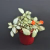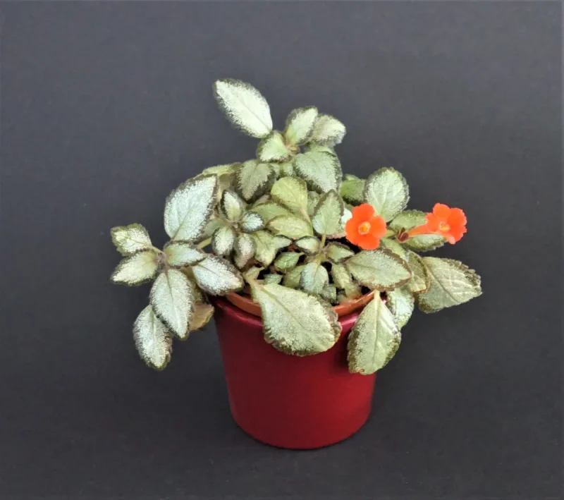Leaves are small, pointed, shiny, light silvery-green color contrasting with very dark olive border.